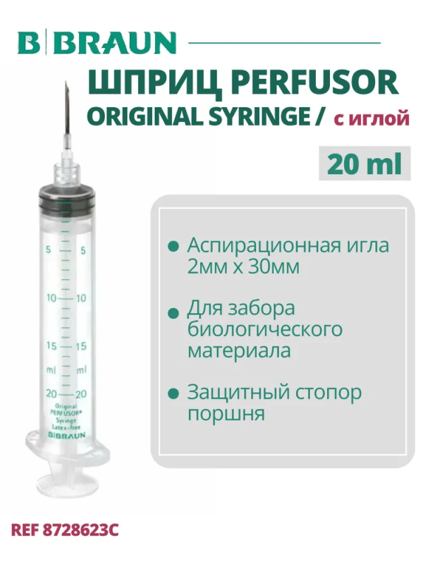 Одноразовый стерильный оригинальный шприц ПЕРФУЗОР для шприцевых насосов (Original Perfusor Syringe 20 ml, Luer Lock) c аспирационной иглой от производителя Б.Браун