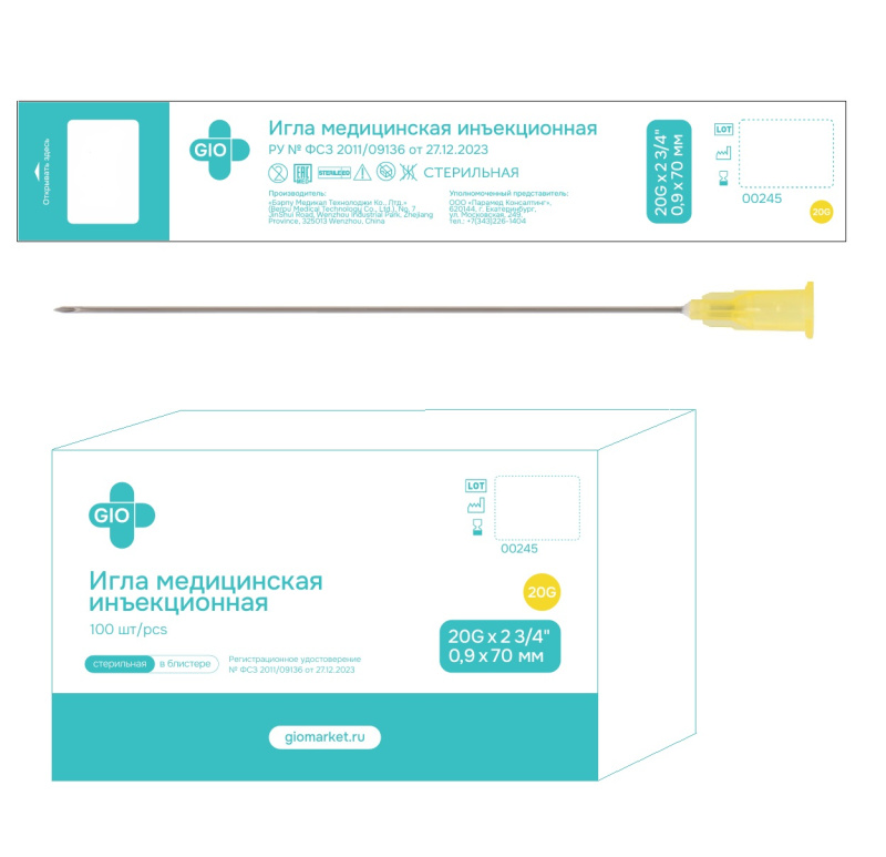 GIO Иглы инъекционные 20G (0,90 х 70 мм), 100 штук