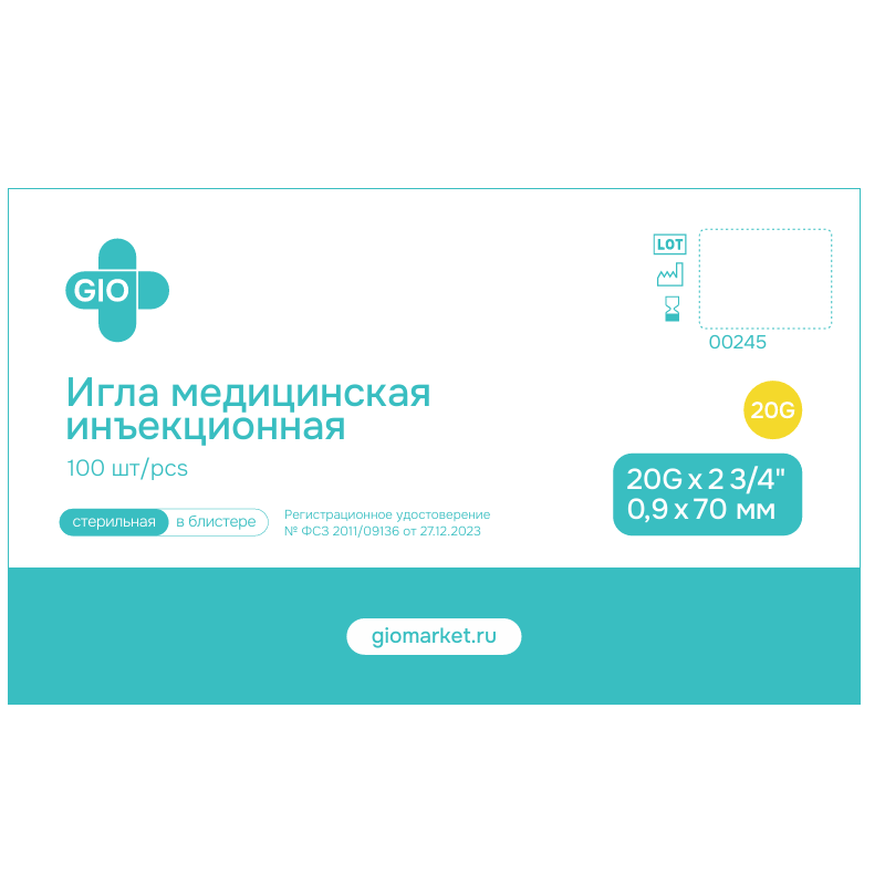 Одноразовая стерильная специальная инъекционная игла 20G (0,90 х 70 мм) - специальная игла для различного применения от GIO (Китай)