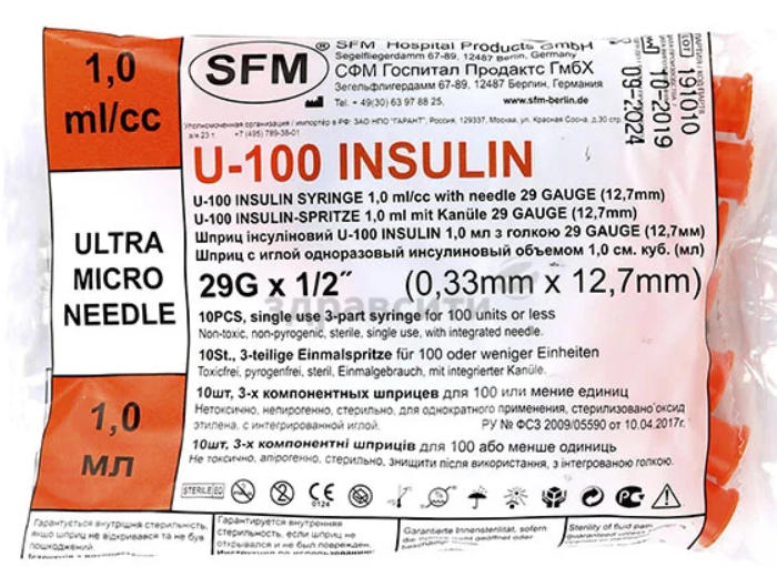 СФМ 1 мл U-100 29G шприцы инсулиновые трехкомпонентные с несъемной иглой 0,33 х 12,7 мм, 10 штук, SFM