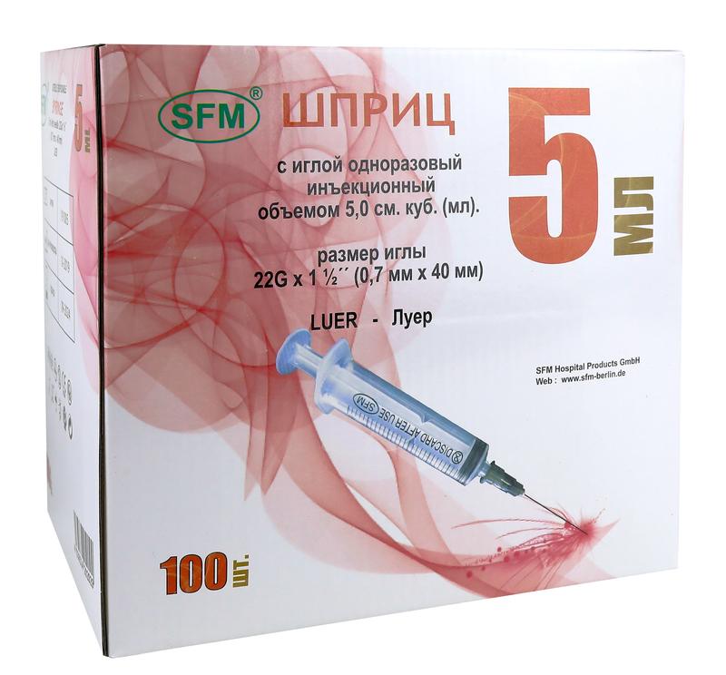СФМ 5 мл шприцы трехкомпонентные, Люэр, с иглой 22G, 100 штук - SFM