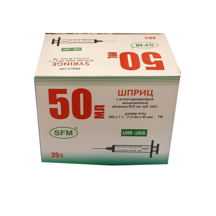 СФМ 50 мл шприцы трёхкомпонентные Люэр Лок, с иглой 18G, 25 штук - SFM