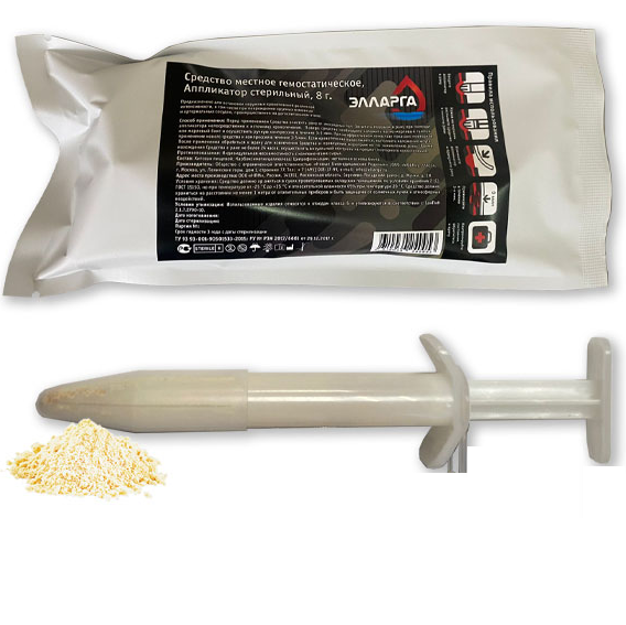 ЭЛЛАРГА - аппликатор стерильный кровоостанавливающий для остановки проникающих ранений в порошке, 8 г. в индивидуальной упаковке от прозводителя ООО НОБР