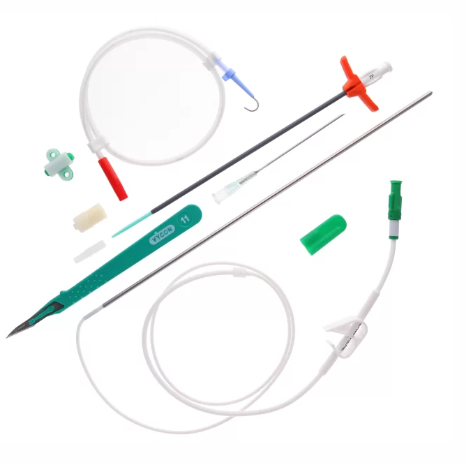 Рентгеноконтрастный силиконовый катетер с подкожной дакроновой манжетой для долгосрочного венозного доступа (парентеральное питание, прием лекарств, антибиотиков, химиотерапия и т.д.) Устанавливают путем венесекции (только катетер) или чрескожной пункции (комплект с расщепляемым устройством Desilet)